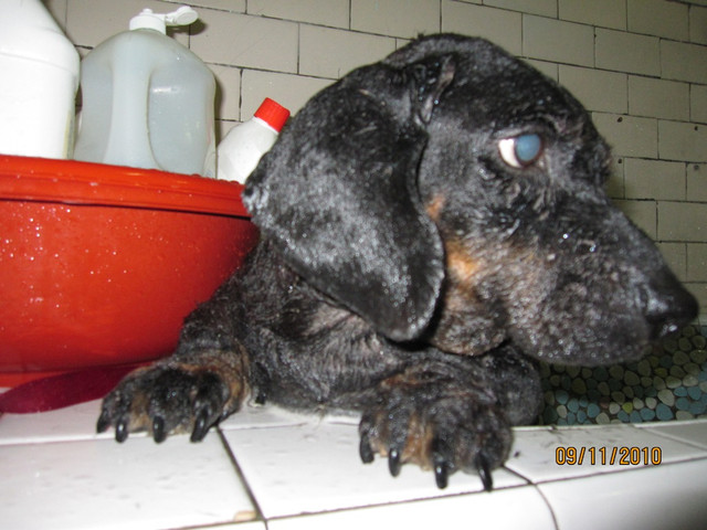 (臘腸狗朱肥肥長年受皮膚病所擾,全身又臭又會出油,還會不斷的冒有